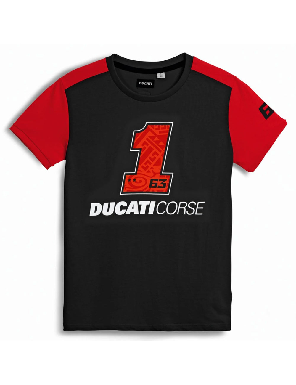 I numeri e il motto del campione risaltano sullo sfondo nero, arricchito dal logo Ducati Corse e dall'iconico rosso che avvolge spalle e maniche.